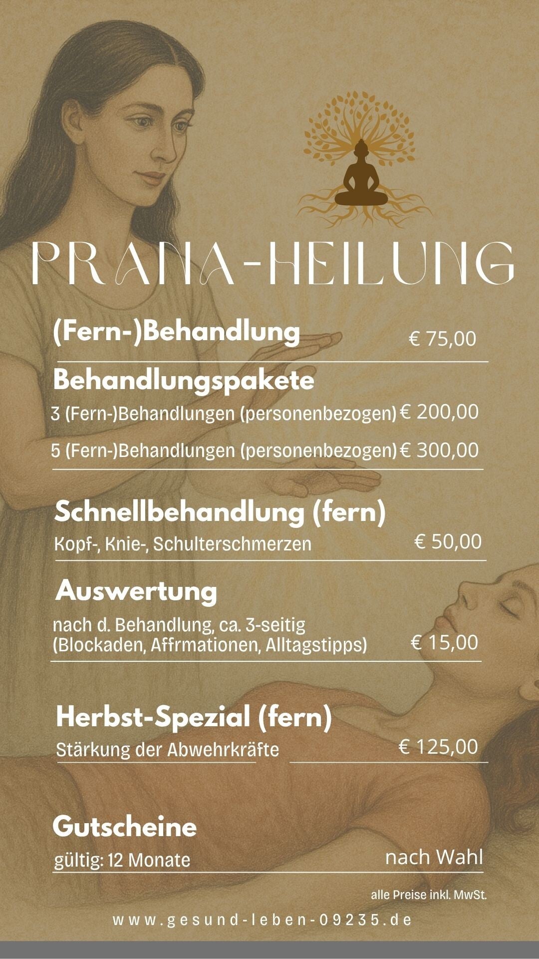Erlebe die kraftvolle Wirkung der Prana-Heilung nach Master Choa Kok Sui! Spüre die transformierende Kraft der Lebensenergie und lass mich dein Energiesystem in Einklang bringen! In einer umfassenden Sitzung werden deine Energiezentren gereinigt und harmonisiert, um Blockaden zu lösen und deine Selbstheilungskräfte zu aktivieren. Das funktioniert wunderbar auch als Fernbehandlung, da ich nicht an deinem physischen Körper, sondern deinem Energiekörper arbeite.