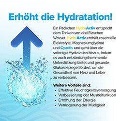 Leider kann es für die meisten Menschen schwierig und anstrengend sein, täglich 11-15 Tassen/Gläser Wasser zu trinken. Aus diesem Grund hat Cerule die ultimative Lösung für die Flüssigkeitsversorgung entwickelt - HydraActiv. Ein Beutel HydraActiv allein entspricht 3 Flaschen/Gläsern Wasser. Die Einnahme von HydraActiv wird Ihnen helfen, Ihre durchschnittliche tägliche Aufnahme von 11-15 Tassen/Gläsern Wasser in kürzester Zeit zu erreichen.